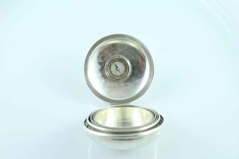 | This is an unusual sterling silver cased collapsible cup fully hallmarked with a small compass inside the case. The case has Gorham silver hallmarks with a monogram to the back lid and the serial number 3955. The front lid has a small ring so it can be attached to a chain. The case is in excellent condition without dings or dents. It opens and closes as it should. It has a strong hinge marked with the digit 4 on each side. When the case is opened, it reveals a nice collapsible cup with five rings and a base. The cup is made of sterling silver a clearly hallmarked with Gorham marks dating this item to 1898. The cup is also marked with serial number A3955. The cup is mint condition and shows no dings, dents or scratches. Inside the front lid fixed a small compass with a jewelled needle that finds North easily and precisely. The compass is covered with a small bevelled glass crystal free of chips or scratches. The overall condition of this item is excellent. It measures 53mm in diameter and has a thickness of 27mm. The largest ring of the cup has a diameter of 47mm. The base has a diameter of 48mm. When fully folded the cup is 50mm high from base to top. When fully collapsed it is only 12mm high. This is a rare and unusual item that would make a perfect gift. |