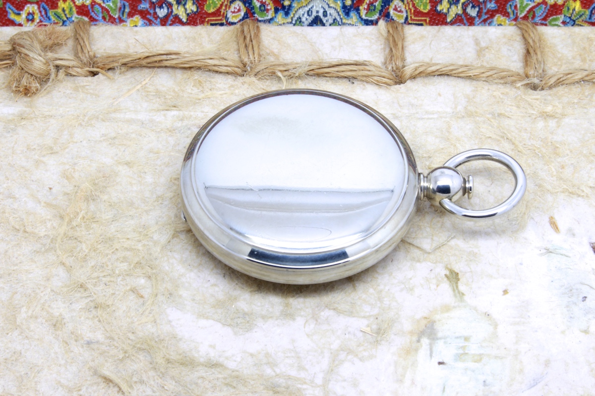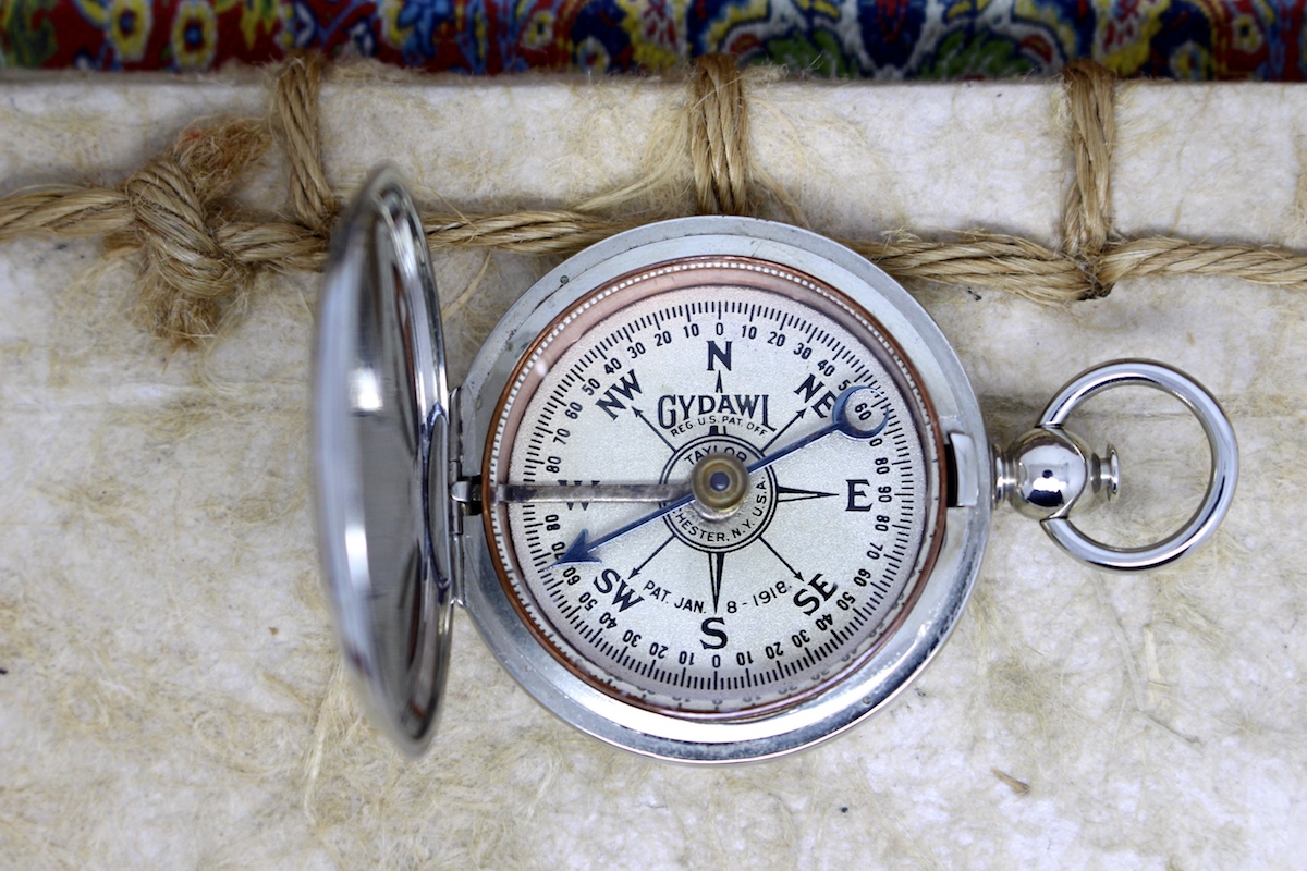 | This is a WW1 antique compass marked Gydawl, Short & Mason, Taylor, Rochester, NY, Pat. Jan. 8 - 1918. It has a blue color needle with a jewelled brass cap. The case is made of Nickel and in excellent condition. The glass crystal also is in excellent condition. The compass has a transit lock that freezes the needle when the lid is closed. The case has a strong hinge and the lid springs open as it should when the button is pushed. It is in full working order and finds North without any problem. It measures around 4.7cm in diameter. |