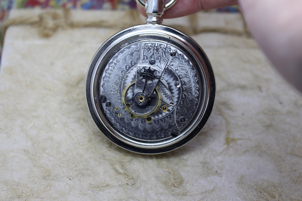 | This is a nice P.S. Bartlett Grade, Waltham pocket watch made in 1892. It is in excellent running order and keeps excellent time. It has been recently cleaned, oiled and timed. SIZE and WEIGHT This is a 18 size 1883 model. It measures around 56 mm (2.2 inches) in diameter (excluding pendant crown and bow). It weighs about 151 g.CASE The open-face case is made of ORESILVER alloy and still in excellent condition for its age with very minimal wear. Engraved with serial number 6704317.It is also marked FAHYS ORESILVER, No 1, PAT. 19th Feb. 1884. Both lids screw on and off as they should. MOVEMENT 18 Size movement in excellent and clean condition.Marked P. S. Bartlett, WALTHAM, MASS. with serial number 5341246, 17 JEWELS, ADJUSTED. It has a SAFETY PINION, which will unscrew in case the main spring is broken. This protects the wheel train and bearings from the sudden released power of the mainspring. This is stem wind and set movement and has 17 jewels. It is running strong and keeps excellent time. In the database (see below), it is said that this movement has 15 jewels. They have been contacted to correct this error. DIAL The white porcelain dial is in excellent condition without any visible hairlines.It is marked WALTHAM. HANDS Blue steel hands are original and in excellent condition.CRYSTAL Thick glass crystal is in excellent condition without scratches or chips.This is a nice pocket watch fully functional and has been professionally checked and timed.